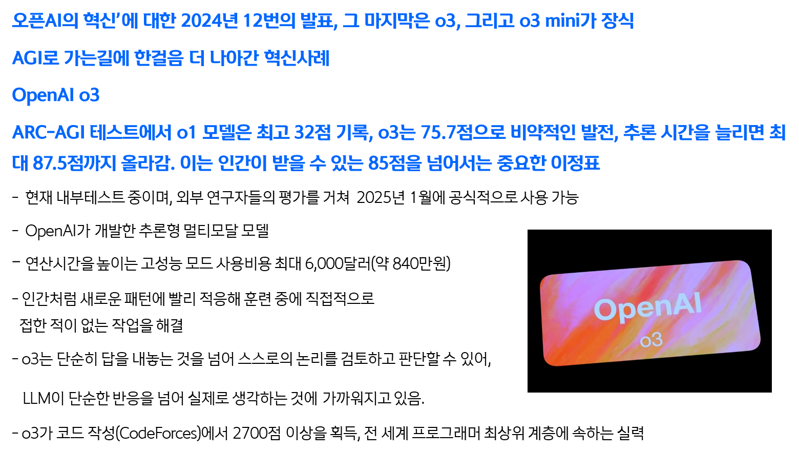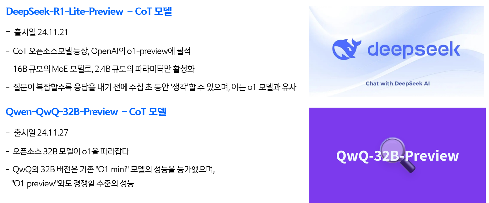 오픈AI에서 O3를 발표하므로써 AGI로 가는길에 이정표를 세운 느낌이다. 오픈모델도 중국의 약진이 두드러지고 생각보다 빠른 COT모델들이 나오고 있다. 이제는 점점 실제 AI가 되가고 있는것 같다