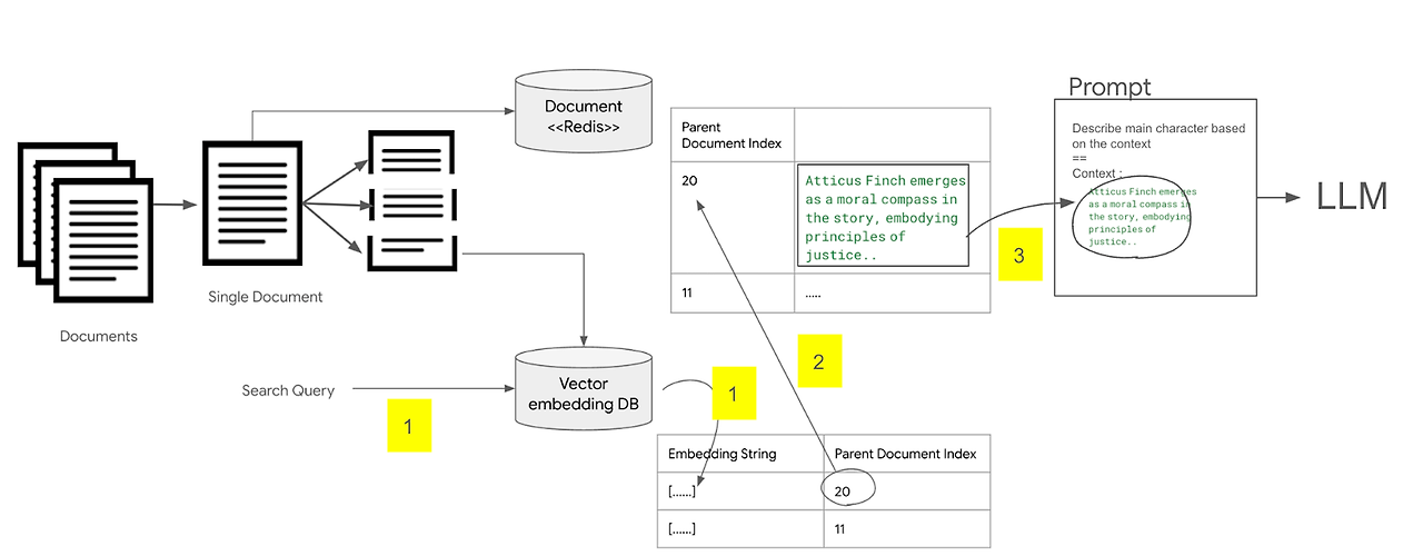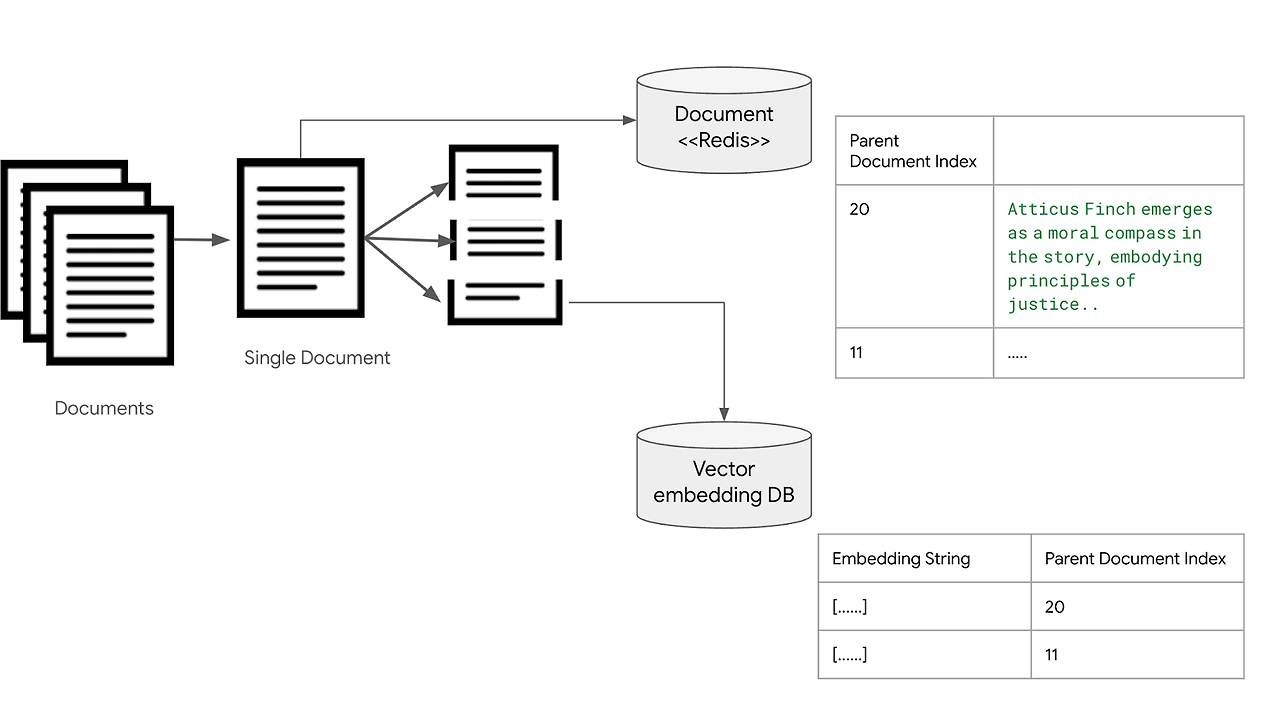 문서들을 작은 Chunk 단위로 나눠서 벡터 임베딩 데이터베이스 (Vector Embedding DB)에 저장하는 과정은 같다. 이때, 필드에 임베딩과 문장의 내용을 저장하는 것이 아니라, 이 문장이 속해 있는 문서의 인덱스를 저장한다. 각 문서는 redis나 DB, 파일 시스템등에 저장해놓는다.