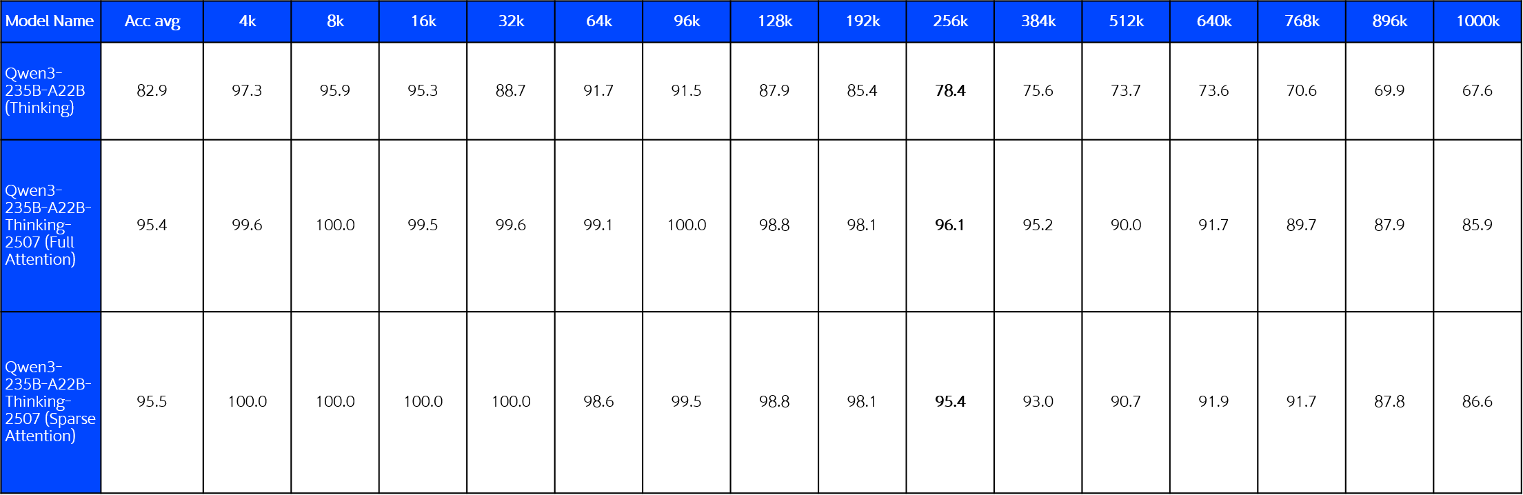 Qwen3-235B-Thinking-2507 모델에는 DCA와 MInference 전략이 도입되었음