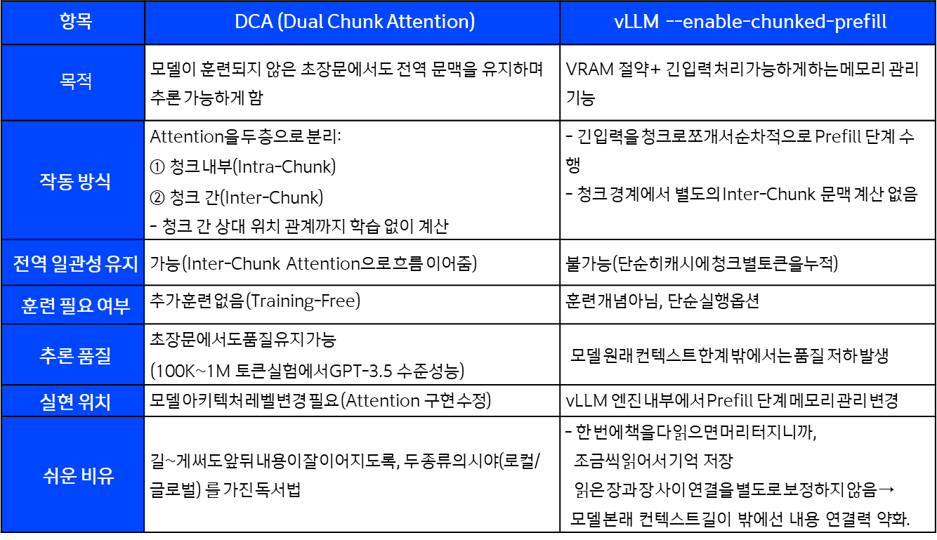 DCA는 두 종류의 어텐션(Intra + Inter) 을 병행해서 “청크 내부 세부 정보 + 청크 간 연결ˮ 둘 다 놓치지 않게 함.