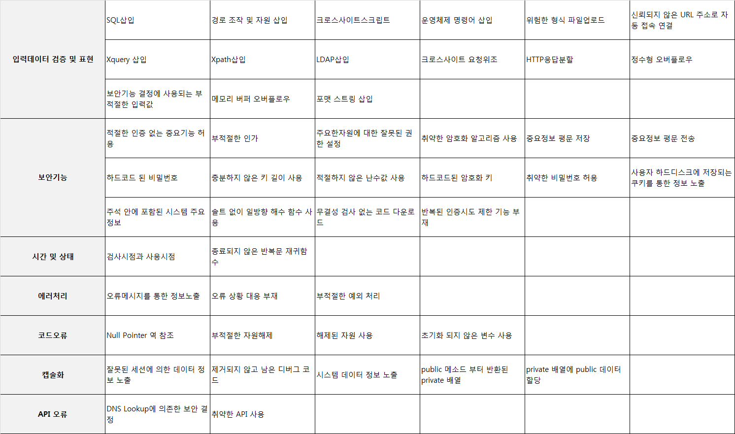위 보안 설계 구현 프로세스를 정의하기 위해서 행정안전부는 아래의 보안약점 47개를 만들어서 설계와 구현 단계 때 해야 하는 내용들을 정리하였다.