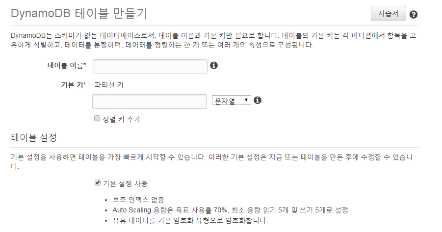 읽기/쓰기 용량모드는 "얼마만큼 테이블 읽기/쓰기를 할 것인가" 하는 내용이다. AutoScaling은 "성능의 몇 프로를 사용하면 프로비저닝 용량을 얼마큼 변동 시킬 것인가" 하는 내용이다. 유휴시 암호화 설정의 경우 CMK를 사용하여 암호화 처리를 할 것 인가? KMS까지 활용하여서 암호화 처리를 할 것 인가의 내용이다.