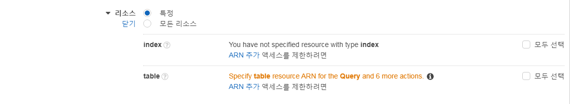 권한을 설정하다보면 리소스 항목에 주황색의 경고 메시지가 나온다. 경고 메시지가 나오면 정책을 생성할 수 없다. 따라서 경고 메시지를 확인해야 한다. "Specify table resource ARN for the Query and 6 more action" 메시지는 위에서 지정한 함수에 관해서 ARN을 지정해야 한다는 설명이다. ARN란 Amazon Resource Name라고 해서 AWS에 존재하는 모든 서비스는 서비스 생성 시 ARN이 나오게 된다. 다시 말해 위 경고는 "어떤 서비스만 접근할 건지 설정이 필요해"로 풀이할 수 있다.