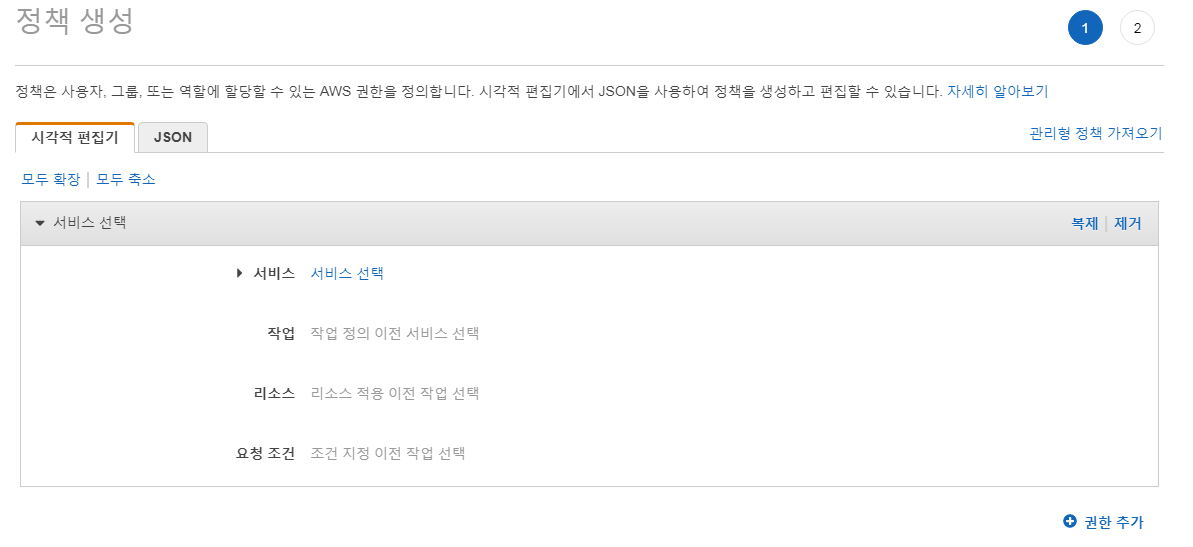 클릭을 하게 되면 정책생성 섹션이 나온다. 시각적 편집기가 있고 JSON 편집 탭이 존재한다. 가능하면 JSON으로 하는 게 좋긴 하다. JSON으로 정책을 작성 및 읽을 수 있다면 현 프로젝트의 정책을 한눈에 볼 수 있다. 하지만 난 시각적 편집기를 사용하겠다. 왜? 아직 JSON 작성 규칙을 보지 않았다.