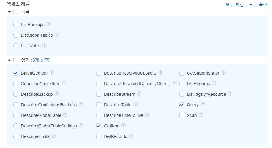 일단 [서비스 선택]를 클릭하고 DynamoDB를 검색한다. DynamoDB를 검색하게 되면 아래와 같은 엑세스 레벨이 나온다.