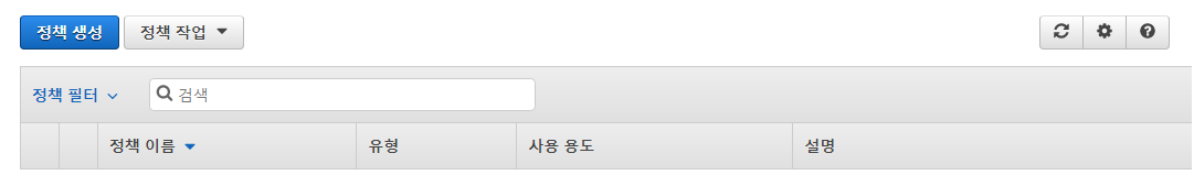 검색창에 IAM이라고 검색 후 클릭을 한다. 그러면 IAM 섹션 페이지로 들어오게된다. 좌측 메뉴에 정책 메뉴를 클릭한다. 정책 메뉴를 클릭하면 위 화면과 동일한 화면이 나올 것이다. [정책생성] 버튼을 클릭한다.