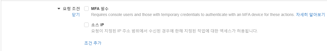 마지막으로 요청조건이다. MFA와 소스 IP가 있다. MFA는 Two Factor(이중 인증)을 할 것인지 물어보는 것이다. AWS에서 할 수 있는 이중 인증 방식은 가상 MFA 디바이스, U2F 보안키, 하드웨어 MFA 디바이스, SMS 문자메시지 기반 MFA 중 사용 가능하다. 소스 IP는 특정 IP만 접근하도록 설정하는 방법이다. 둘 다 권장사항이지만 가능하면 설정하는 게 좋다.