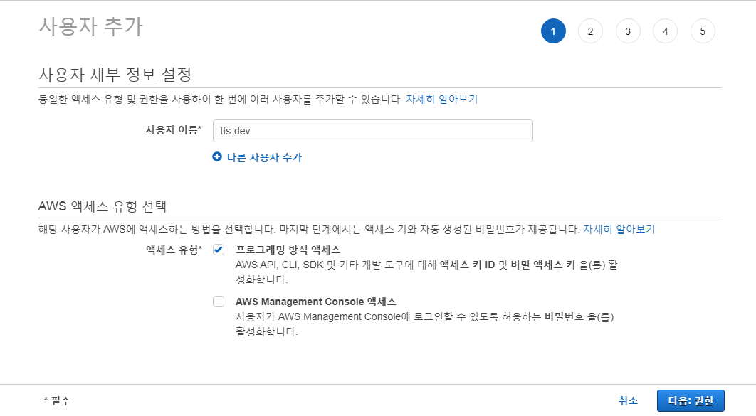 사용자 추가 색션에서 사용자이름, 액세스 유형을 설정한다. [다음:권한] 버튼을 클릭하면
