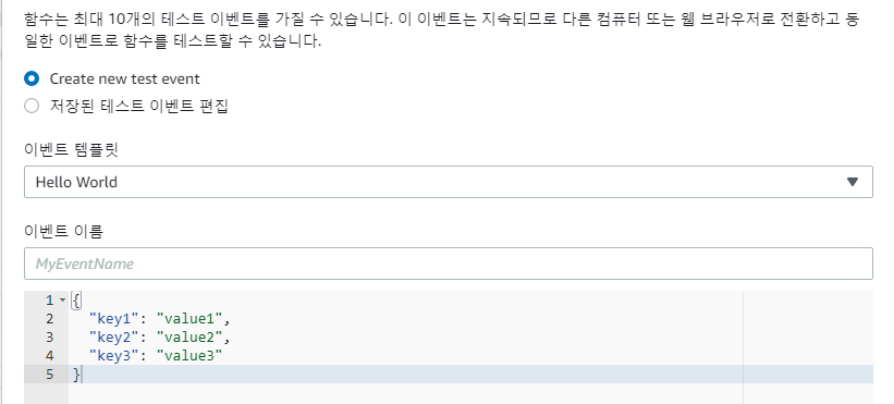위에 보면 [테스트] 버튼 옆에 SelectBox가 존재한다. 테스트 이벤트를 설정할 수 있는 곳이다. "테스트 이벤트 구성"을 클릭해 준다. 처음에는 아무것도 없어서 신규로 작성하도록 되어 있을 것이다.
