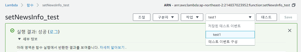 Amazon CloudWatch 좌측 메뉴 중 [로그] 메뉴에 진입하게 되면 내가 만들어서 호출한 "setNewsInfo_test"라는 함수의 로그가 보이기 된다. setNewsInfo_test 로그를 클릭해준다.