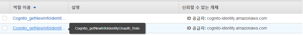 다음에는 Cognito와 IAM 역할을 연결시켜줘야 한다. 그래야지 호출된 Cognito로 어떠한 서비스만 접근 가능한지 판단할 수 있다.
