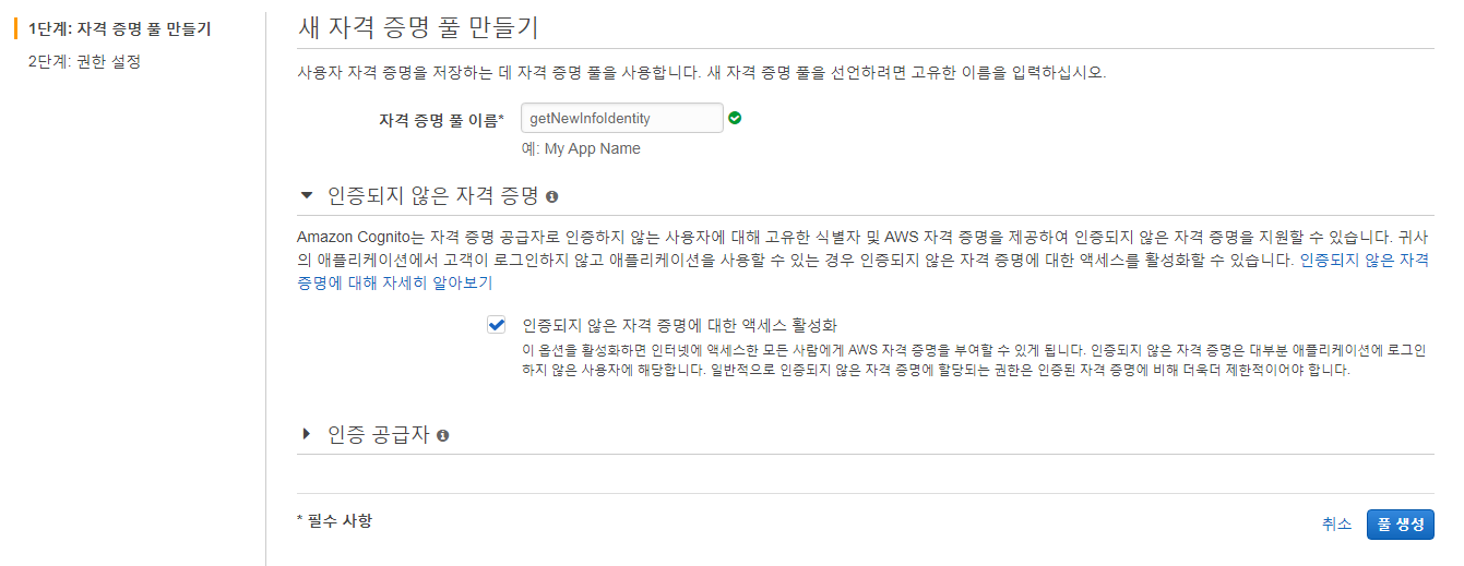 그런데 "인증되지 않은 자격 증명"을 클릭할 경우 위 종류의 [인증 공급자] 사용 없이 AWS 서비스에 접근할 수 있다. 이번에 만들 웹사이트의 경우 로그인 기능은 필요 없다. 따라서 [인증되지 않은 자격 증명에 대한 액세스 활성화]를 체크해 준다. [풀 생성] 버튼을 클릭하면 아래와 같은 화면이 나온다.