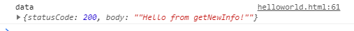 그런 다음 helloworld.html을 다시 호출한다. 웹 콘솔에서 아래와 같은 log가 나오면 Lambda와의 통신이 성공한 것이다.