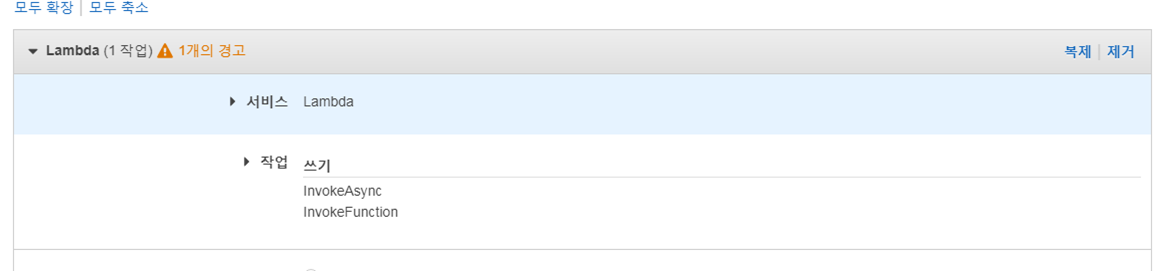 IAM에 들어가면 아까 Cognito를 생성할 때 만든 Cognito 이름의 IAM 역할이 두 개 생성된 것을 확인할 수 있다. 나의 경우 자격증명 없이 Cognito를 사용하기 때문에 Unauth_Role를 선택해서 사용한다. IAM 역할을 클릭한 다음 나오는 화면에서 [인라인 정책]을 클릭한다. 그리고 아래와 같이 Lambda의 역할을 추가한다.