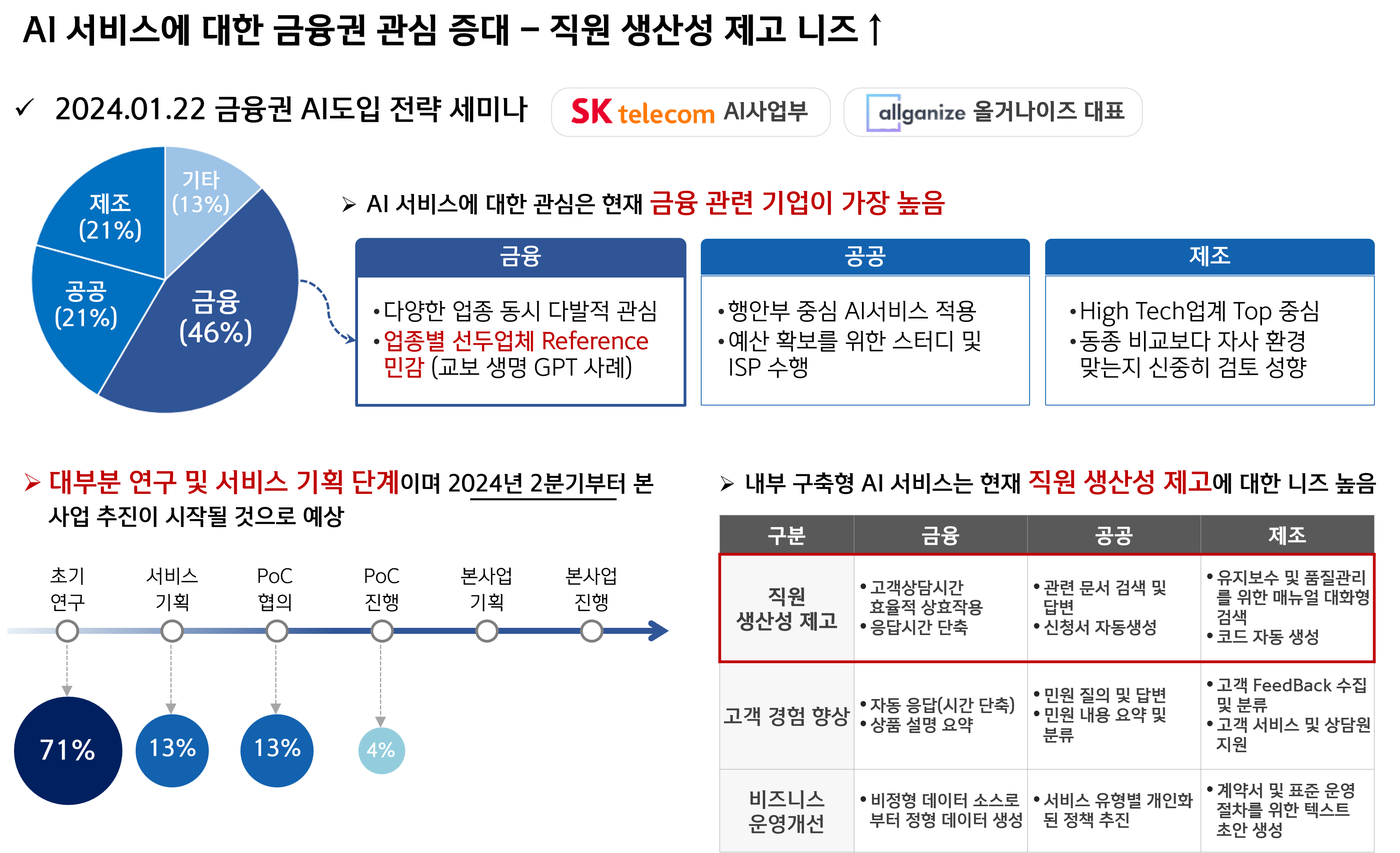 IT분야는 점점 AI에 대한 관심도가 커지고 있고 투자나 구축도 인공지능외는 앞으로 점점 없어질듯 하다.LLM 분야에서 상반기에 키워드는 도입기를 지나 하반기부터는 AI 플랫폼 구축이 확대 될것으로 보인다.금융의 환경이 망분리 규제 완화가 화두이긴 한테 조만간 정리될것으로 보이고, Saas기반 이던 온프라미스 기반이던 둘다 대응가능한 AI 전략이 필요할 것이다.LLM모델의 발전속도는 하루가 다르게 변화되고 있고, 국외에 다양한 오픈소스 모델이나 폐쇠형 모델 등의 추이를 잘 살펴보고있어야 한다. 국내에서는 업스테이지 솔라가 가장 우위를 보이고 있고, 가장 많은 고객을 확보할것이다.LLM 모델에 대한 연구보다는 모델에 대한 파인튜닝 기법에 대한 연구가 더 효율성이 있어보인다.AI 플랫폼은 LLM모델에 대한 ..